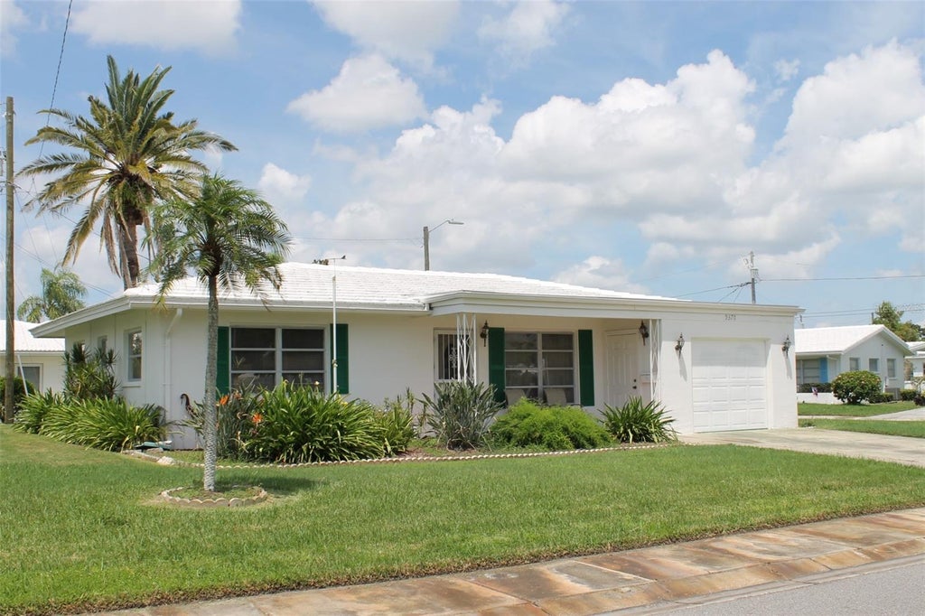 This single-family home, on a corner lot, located in Mainlands of Tamarac by the Gulf, Unit 1, is a Carlton Model that has been nicely landscaped. There is even an electrical outlet under the graceful palm tree in the front yard, ready for seasonal decorative lighting! A really nice location bonus - The Mainlands Golf Course Clubhouse is less than 1/10th of a mile away, across the street and the Mainlands Unit 1 Clubhouse & Heated Pool is 2/10ths of a mile away on same side of street! Relax & enjoy, at any time of day, on the welcoming covered front porch or have friends & family over for outdoor grilling on the large back patio that has a decorative wall partially surrounding it. The 2 bedroom, 1 and a half bath home could use some TLC inside! Not reflected in the square footage is the 15.5’ x 9.4’ Florida room and the inside 6.11’ x 9’ Utility Room / laundry room & half bath located off the kitchen. 2 Pets (dog/cat) are welcome in Unit 1 with no weight limit—your furry companions will love the Florida lifestyle just as much as you! While ownership doesn’t require you to be 55+, at least one permanent resident must be 55+, and others in the home must be at least 40. Living in the Mainlands is about embracing a lifestyle. This 55+ golf cart-friendly community boasts the public family owned Mainlands Golf Course, a public Par 67 Florida Links-style course. Within Mainlands are 7 units, mini subdivisions that have their own clubhouse, pool, and a variety of social clubs. Enjoy an active lifestyle with neighbors who become friends and make the most of a variety of community events. This community is situated in the heart of Pinellas County, you’ll be just minutes away from pristine Gulf Coast beaches, cultural and arts events, world-class dining, and endless outdoor activities. With convenient access to major highways, you’ll also be within reach of the vibrant entertainment and sporting scene in Tampa Bay, including professional football, baseball, and hockey.
